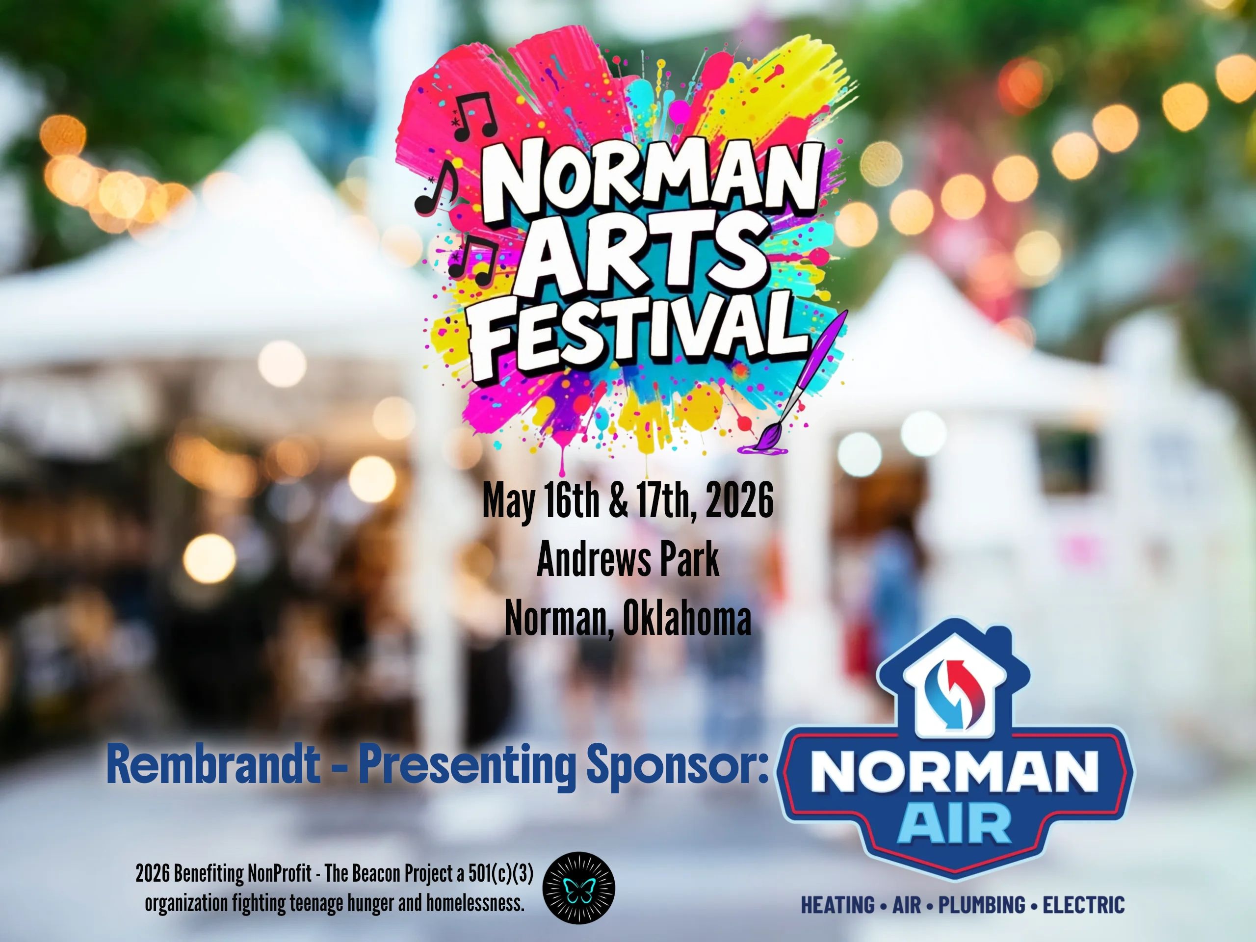 The 2026 benefiting non-profit for the Norman Arts Festival is The Beacon Project, Norman, OK. Their mission is to end chronic hunger and homelessness among teens by going beyond meeting basic needs - restoring dignity, stability, and hope. To learn more about The Beacon Project click the "Visit" button below.